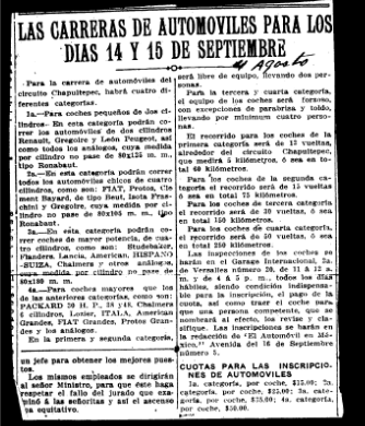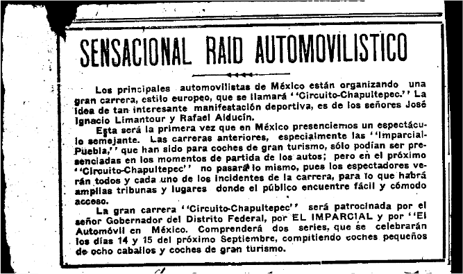 La primera carrera realizada en forma (en una pista urbana de la que esta investigación tenga noticia hasta el momento) fue la que por iniciativa de los señores José Ignacio Limantour y Rafael Alducin se llevó a cabo en la Ciudad de México los días 14 y 15 de septiembre de 1913, que sin duda alegraron las ya de por sí concurridas fiestas patrias con que México conmemora su independencia en el llamado "Circuito Chapultepec". Así pues, Limantour y Alducin solicitaron autorización al gobierno del Distrito Federal para verificar y pedir que se realizaran algunas obras en la "loma del Rey y la reparación de la calzada existente en Anzures" (hoy calzada de Chivatito), de manera que se contara con una pista adecuada para la competencia. Solicitaron de manera especial que fueran modificadas algunas curvas para prevenir accidentes y se construyeron tribunas para los espectadores, que se procuró ofrecieran todas las garantías de seguridad posibles. La carrera fue patrocinada por el gobernador del Distrito Federal, por el periódico El Imparcial, por la revista El Automóvil en México y por algunos de los distinguidos miembros del Club automovilista capitalino, destinando sus ganancias como donación al Asilo de Mendigos.